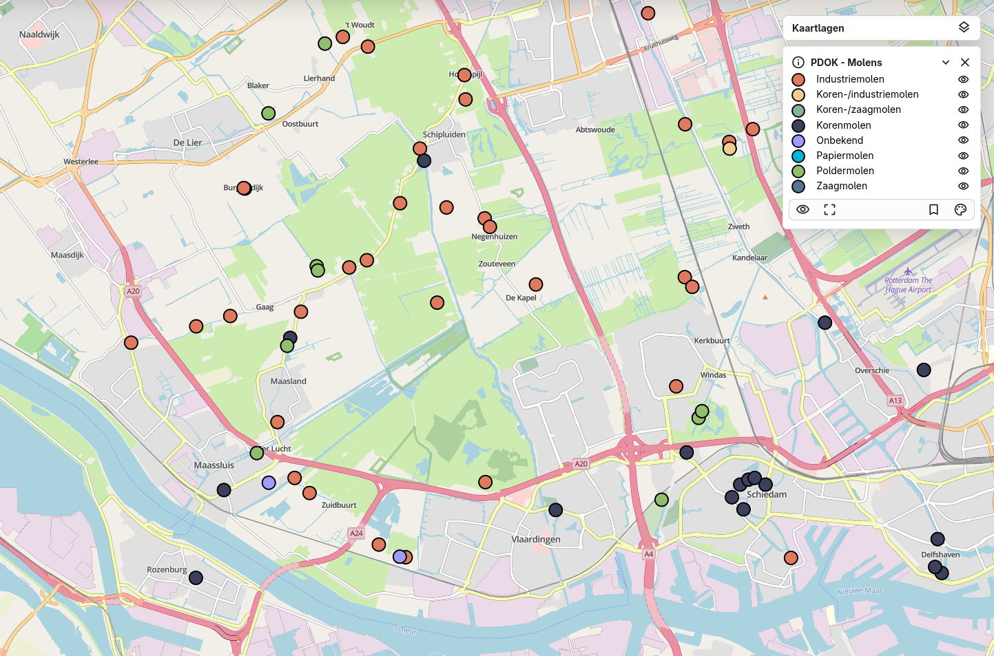 Voor deze handleiding over de styling van punten is gebruik gemaakt van de dataset Molens, Vuurtorens en ROI voorzieningen. Aan de hand van deze dataset zullen enkele voorbeelden gegeven worden van de stylingsmogelijkheden. Alle simpele styling voorbeelden zijn onderdeel van de "Genereer style” functie in MapGallery. Vervolgens worden de geavanceerde stylingopties besproken.