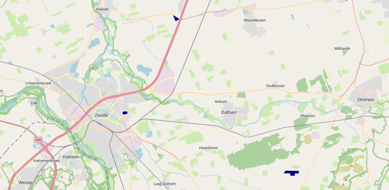 In dit voorbeeld zijn de vlakken niet zichtbaar bij een schaal van 1:700.000 of kleiner, door de volgende instelling: "scaleDenominator": { "max": 700000 }. Dit betekent dat de vlakken alleen zichtbaar zijn bij verder inzoomen (dus bij een schaal kleiner dan 1:700.000).Op deze manier blijft de kaart overzichtelijk en worden te veel vlakken op grote schaalniveaus voorkomen.